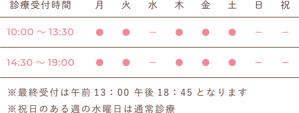- 10:00 〜 13:00 / 14:30 〜 19:00